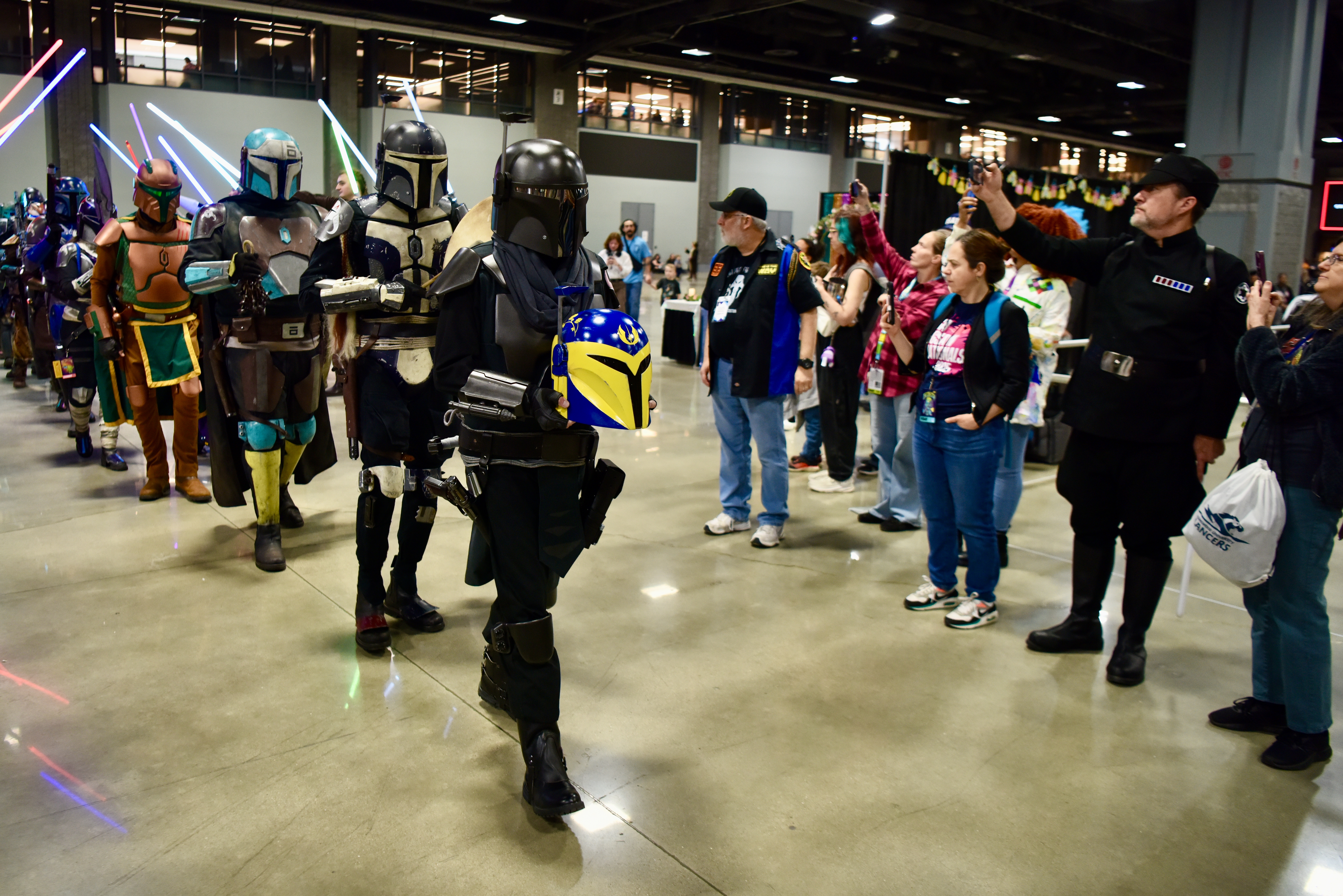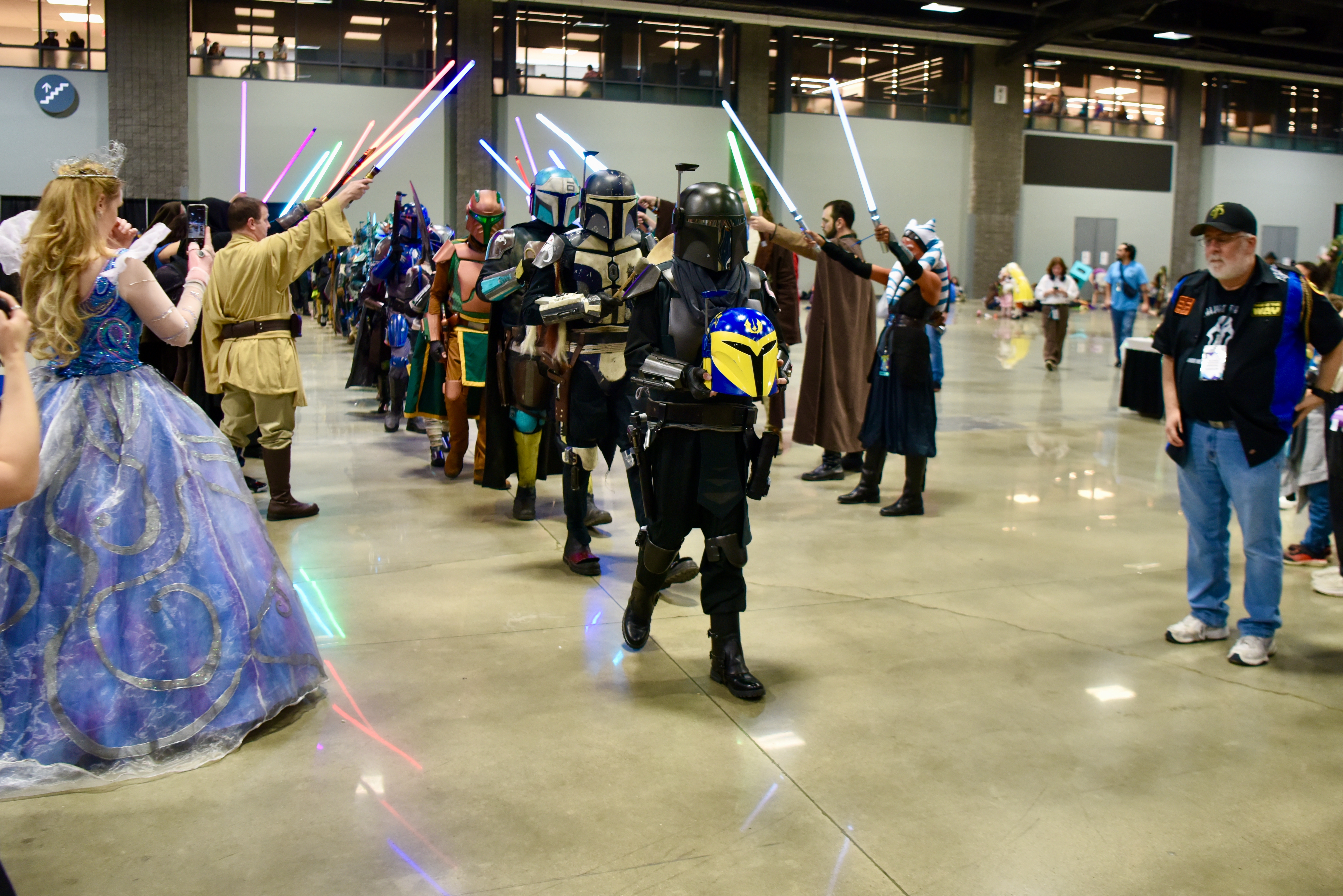 A Princess Commands Testing the Height of the Lightsaber Arch Salute Princess Supervision Helmet of the Fallen The March Proceeds Percussion Armored Walk Gorgeous Colors and Cape Honorable Line of Mercs Marching Foward Astromech Droids Bringing Up the Rear 1 Astromech Droids Bringing Up the Rear 2 Lightsabers Up Jedi Sharing in the Ritual The Glow