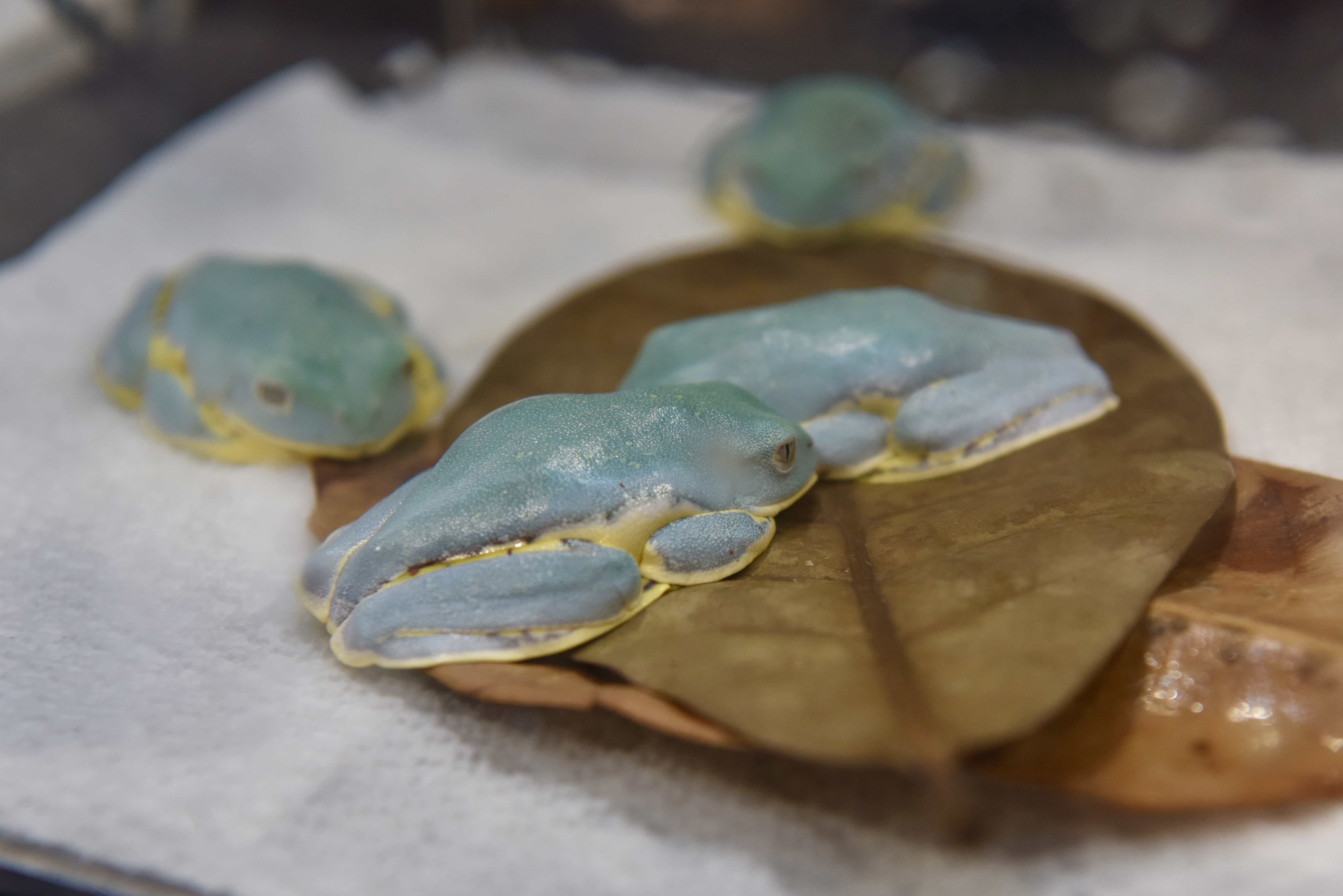 Sylvias LeaFrog Laying Flat On a Leaf Vietnamese Mossy Frog Amazon Milk Frog Being Still Amazon Milk Tree Frogs in Line Crazy Critters