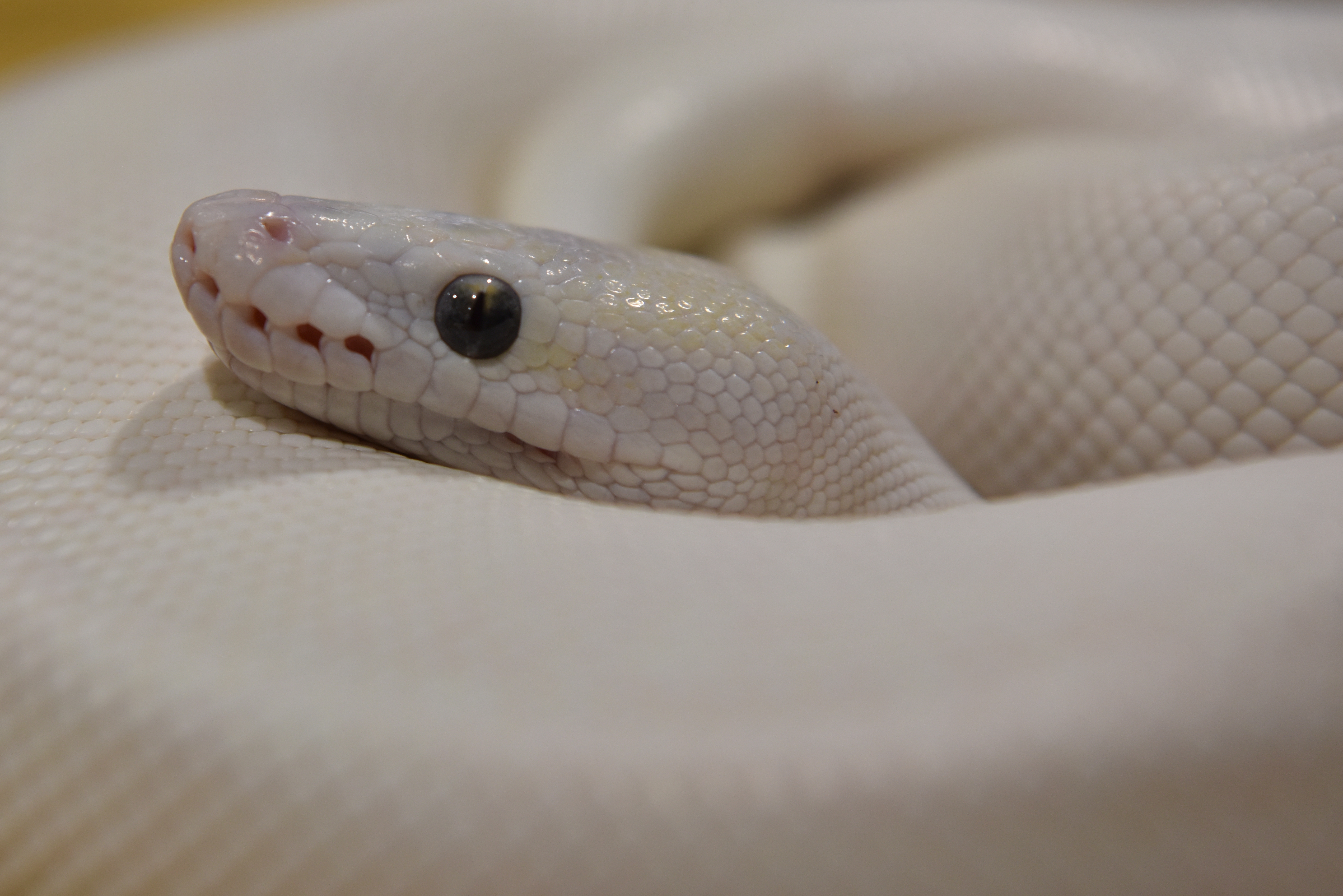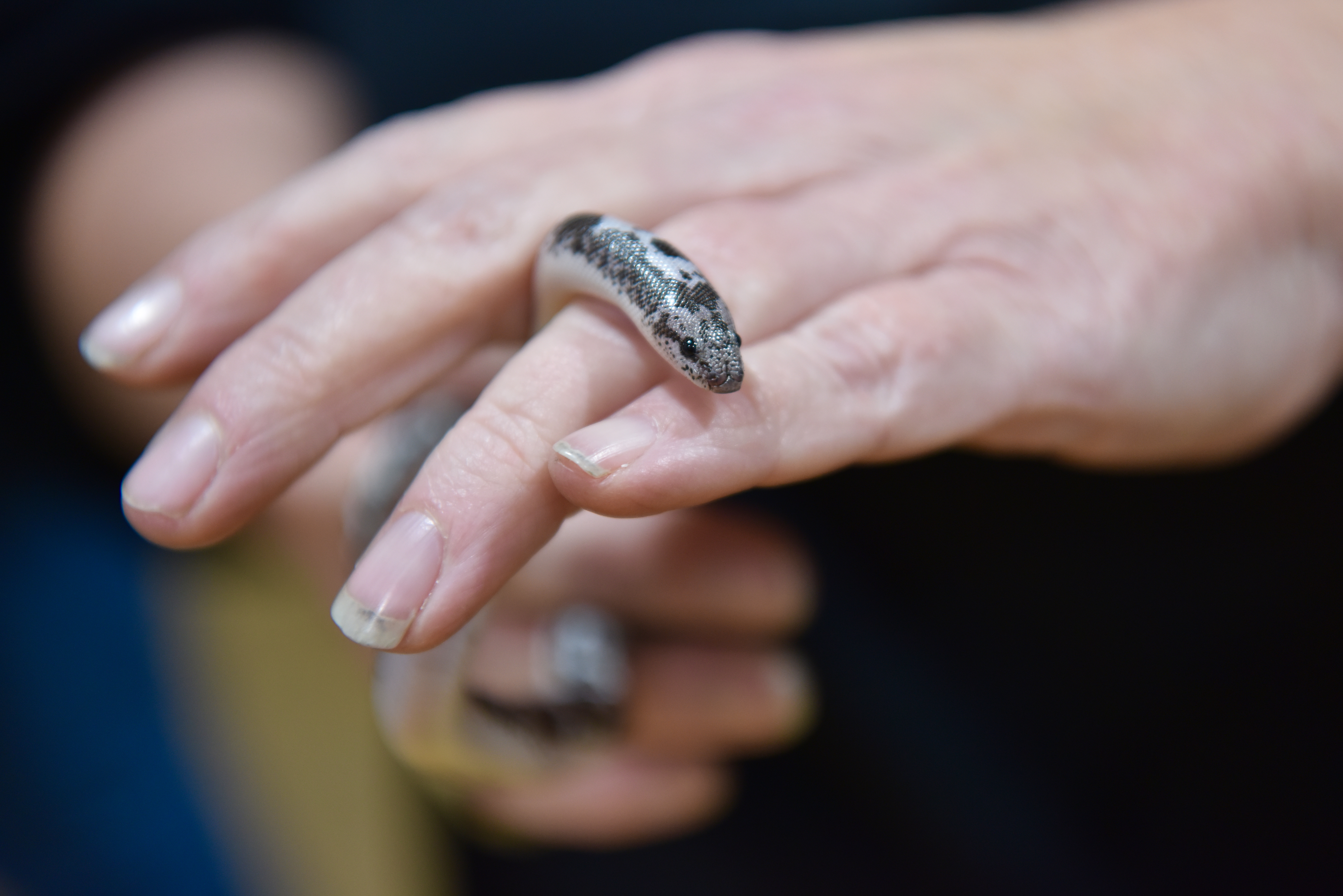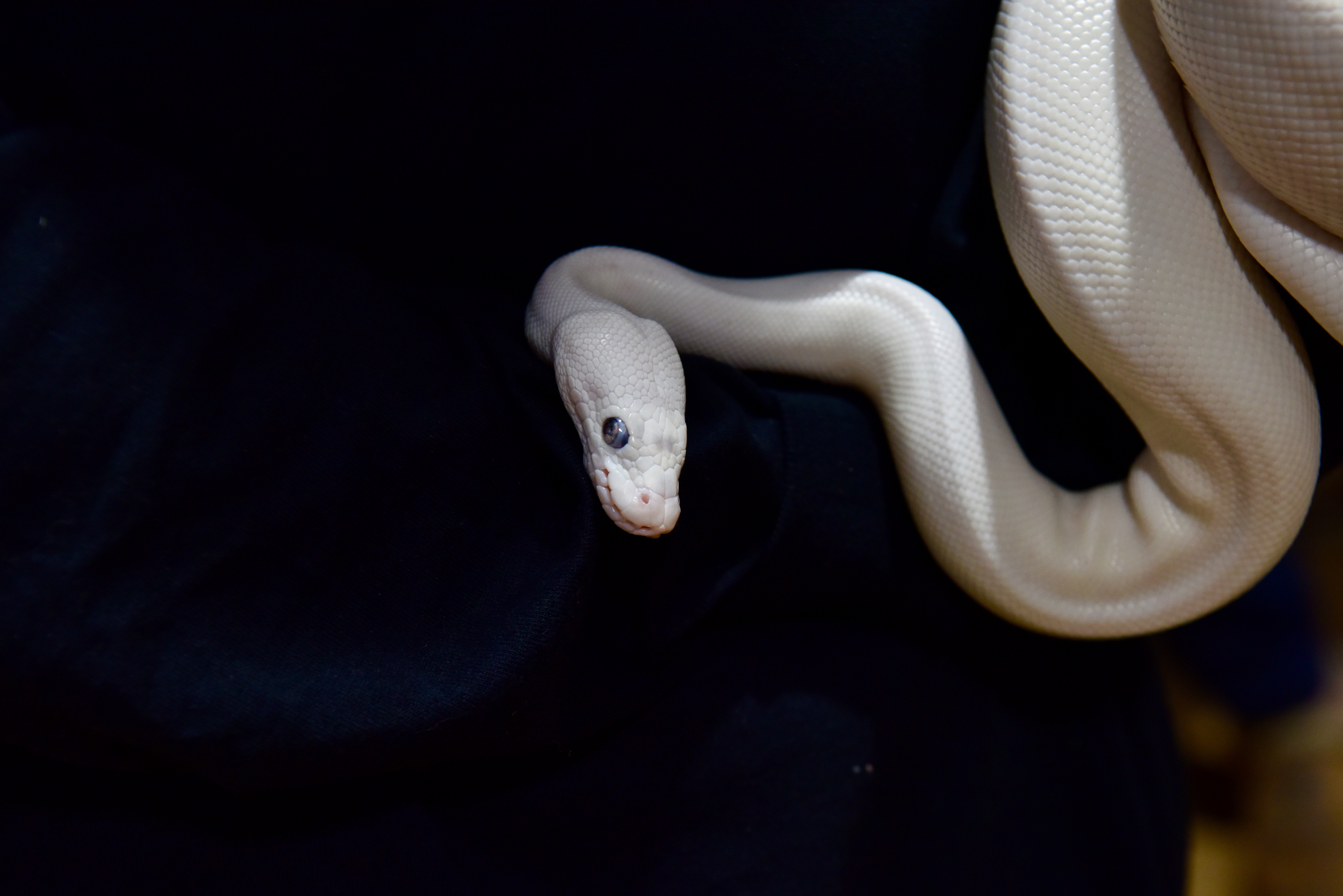 Blue Eyed Leucistic Ball Python at Rest Head Rest Shiny Head Curiosity Piqued Raised and Wondering Kenyan Sand Boa Wondering Where to Burrow Kenyan Sand Boa Tail to Head Tongue Fully Out Burrowing Through Fingers Hovering Bright Against the Dark Ballmore Pythons and Solstice RoyalsHagerstown Scales and Tails